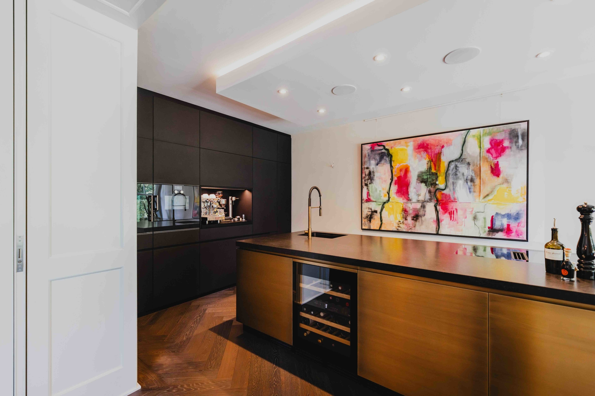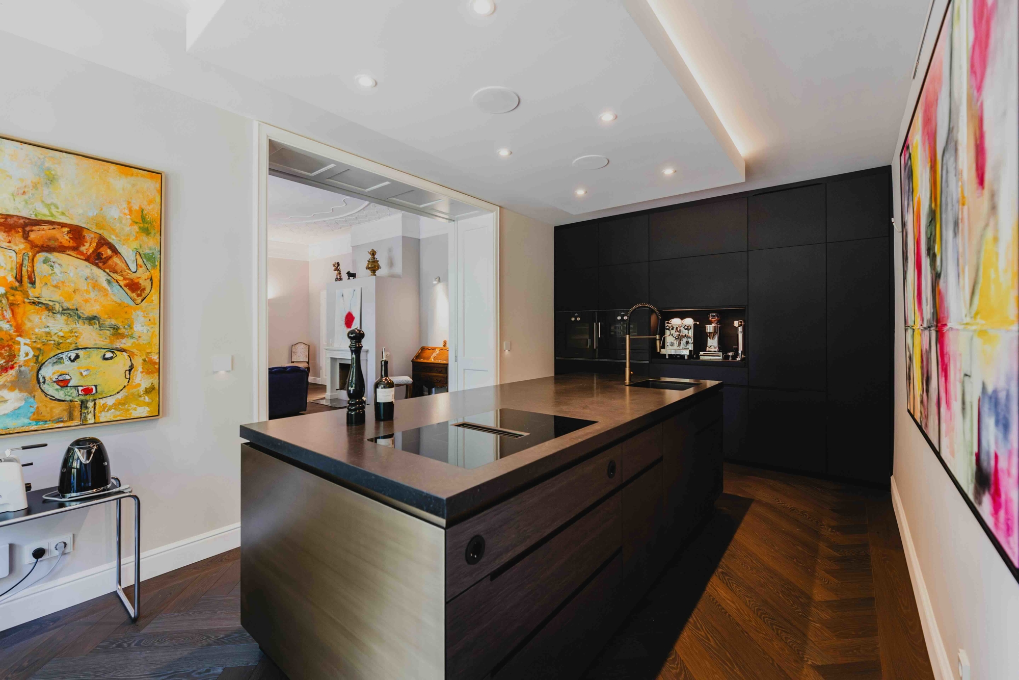Ein besonderes Highlight ist die maßgefertigte Küche mit Arbeitsflächen aus massivem Nero Assoluto. Sie ist mit hochwertigen Geräten ausgestattet und lässt sich dank großer Schiebetüren flexibel in den Wohn- und Essbereich integrieren – für ein stilvolles Raumgefühl mit maximaler Funktionalität.