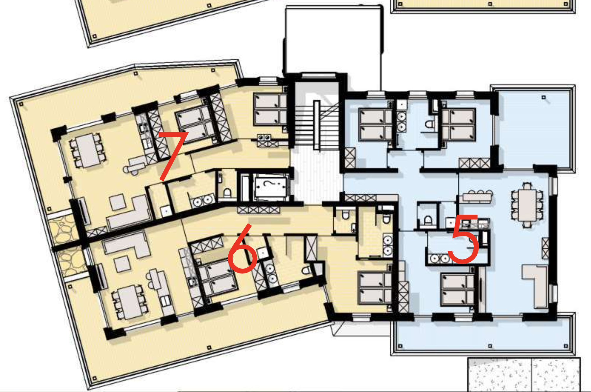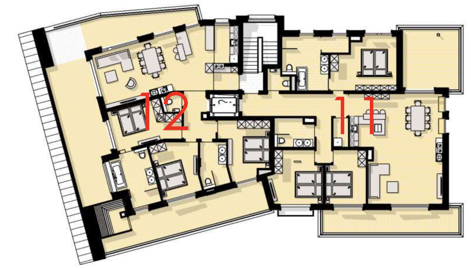 Beide Strukturen sind durch ein gemeinsames Untergeschoss und einer Tiefgarage miteinander verbunden. Jedes der beiden Häuser verfügt über ein eigenes Stiegenhaus mit einem Personenaufzug für einen bequemen Zugang.