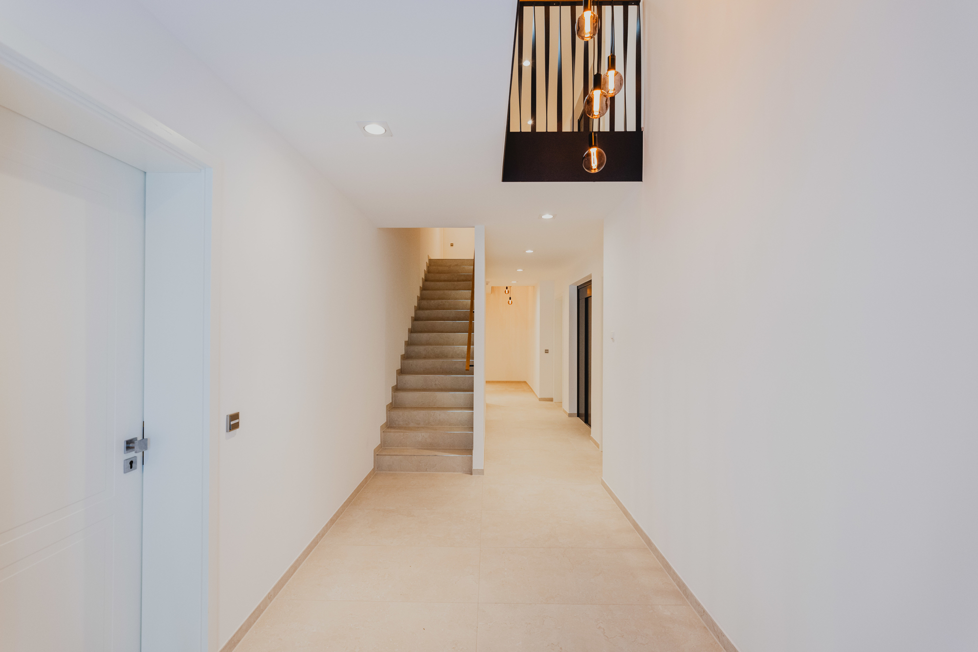 - Treppenhaus mit offenen Galerien zwischen den Geschossen mit hängenden Designlampen