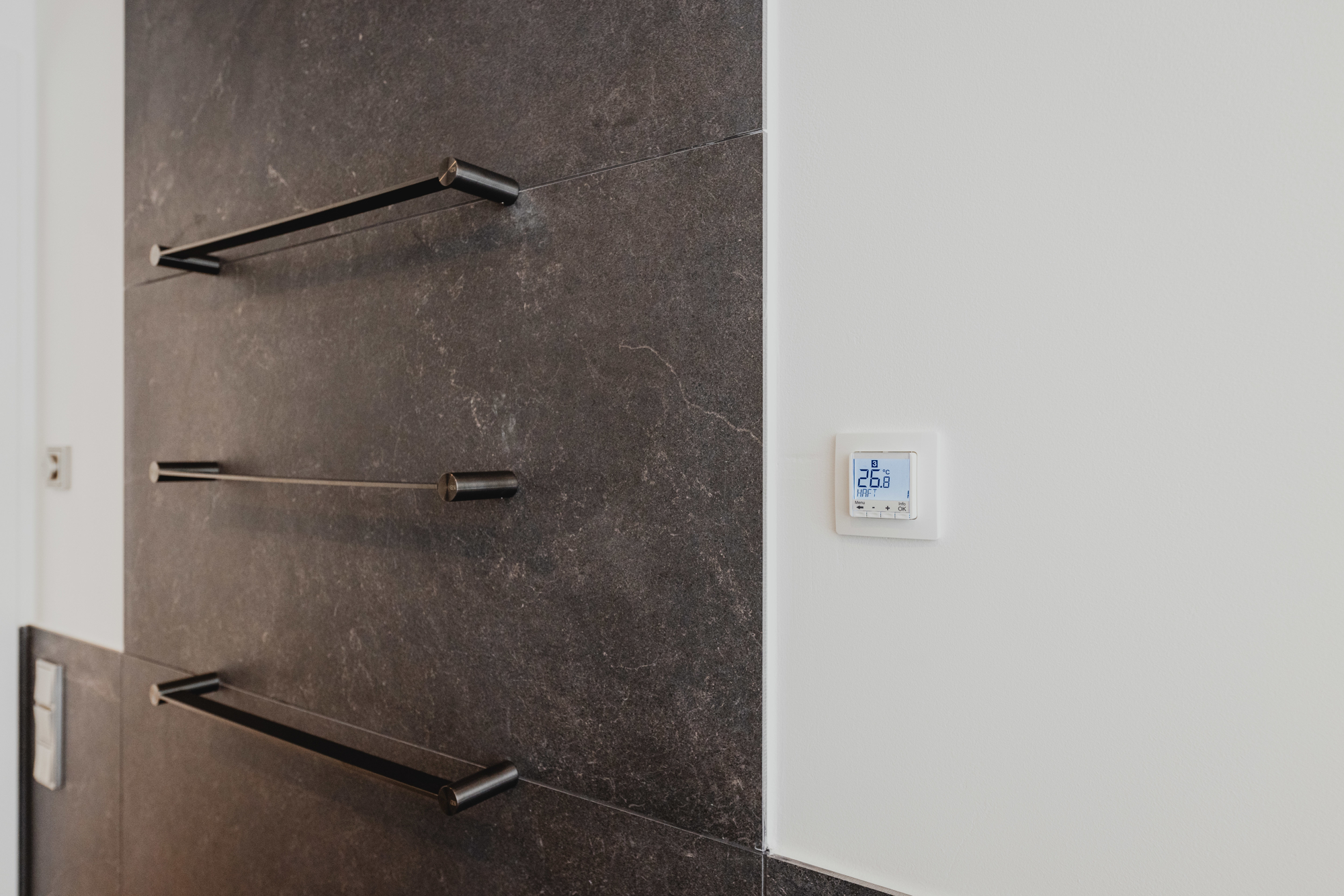 Ein edel ausgestattetes Designbadezimmer – mit beheizbarer Wand und Zugang zur umlaufneden Terrasse bietet Wellnesskomfort auf höchstem Niveau. In der gesamten Wohnung sorgt eine einzeln regulierbare Fußbodenheizung für wohlige Wärme. Der integrierte Hauswirtschaftsraum bietet praktische Funktionalität im Alltag.