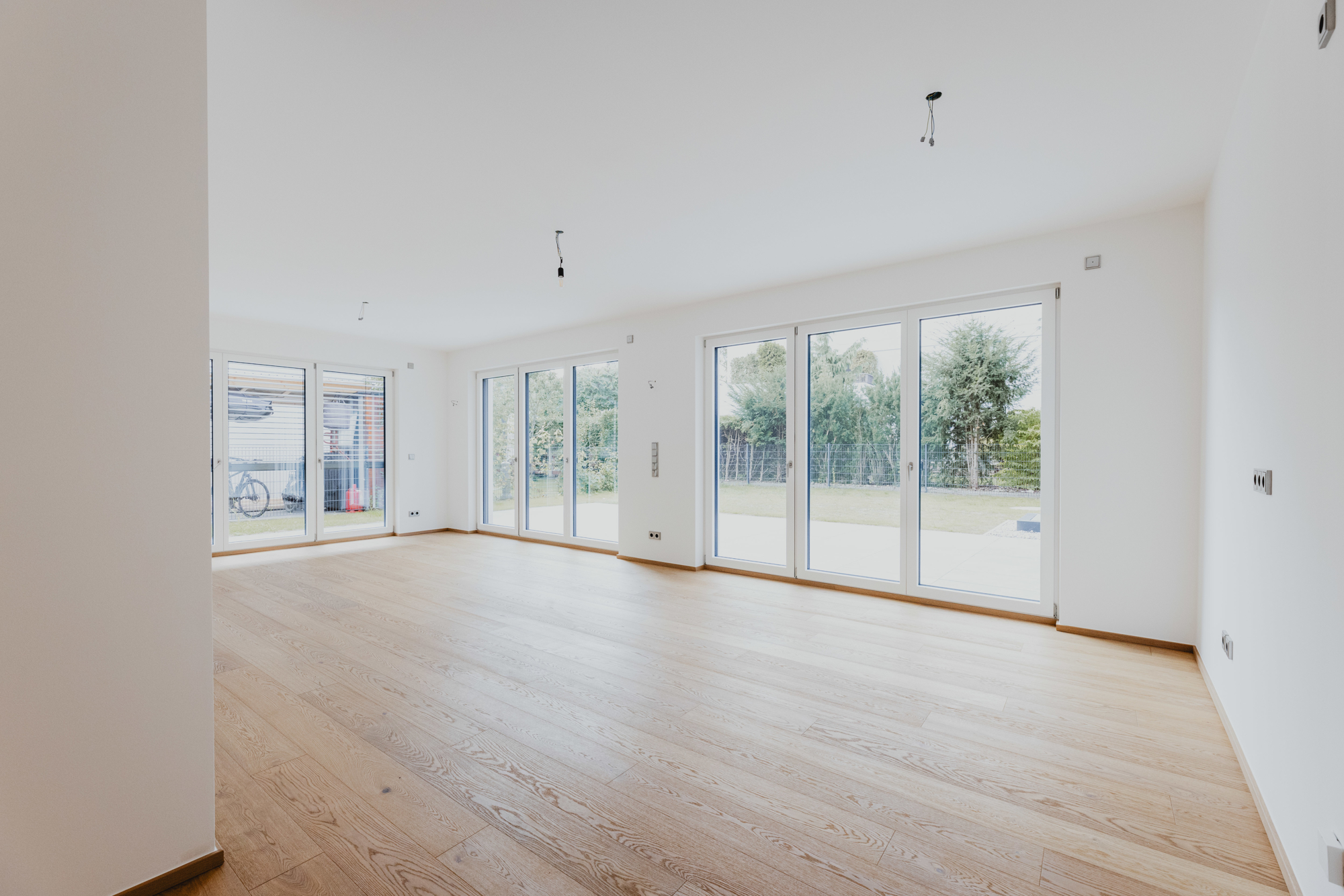 Bereits beim Betreten beeindruckt die großzügige Raumwirkung mit Deckenhöhen von über 2,7 Metern, Türen mit über 2,2 Metern Höhe und einem offenen Wohnkonzept. Bodentiefe XXL Holz-Alu-Fenster durchfluten die Räume mit Licht und sind mit elektrisch steuerbaren Außenlamellen ausgestattet.