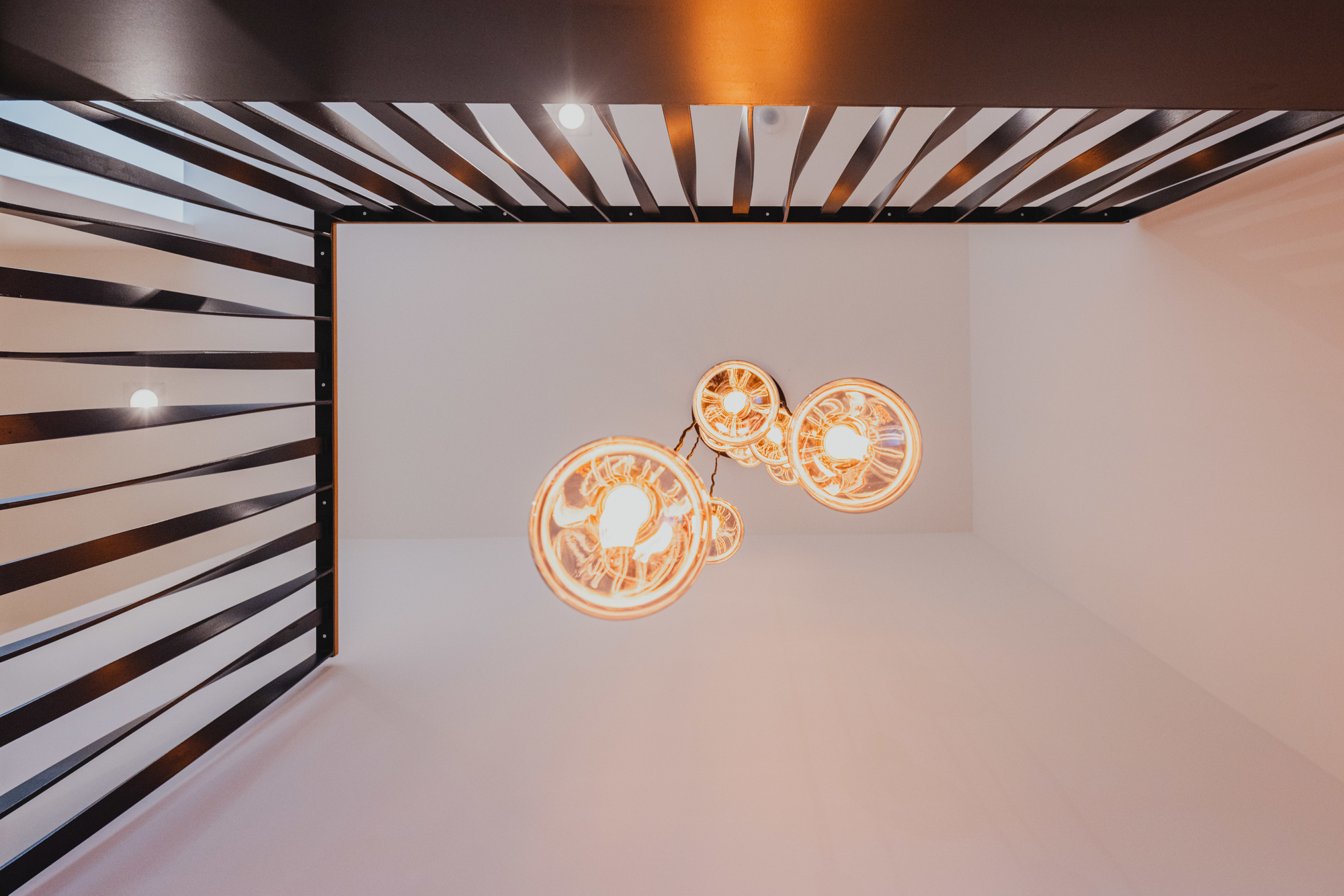 • Treppenhaus mit offenen Galerien zwischen den Geschossen mit hängenden Designlampen