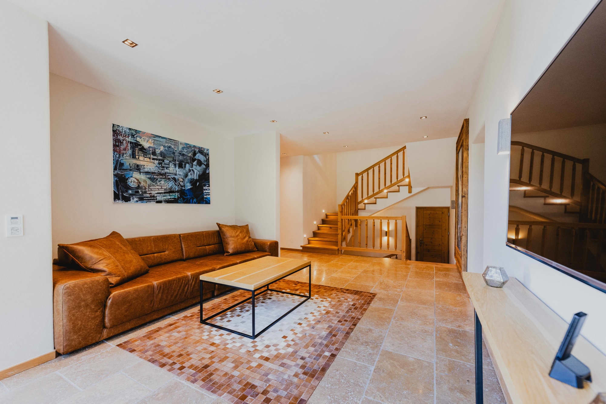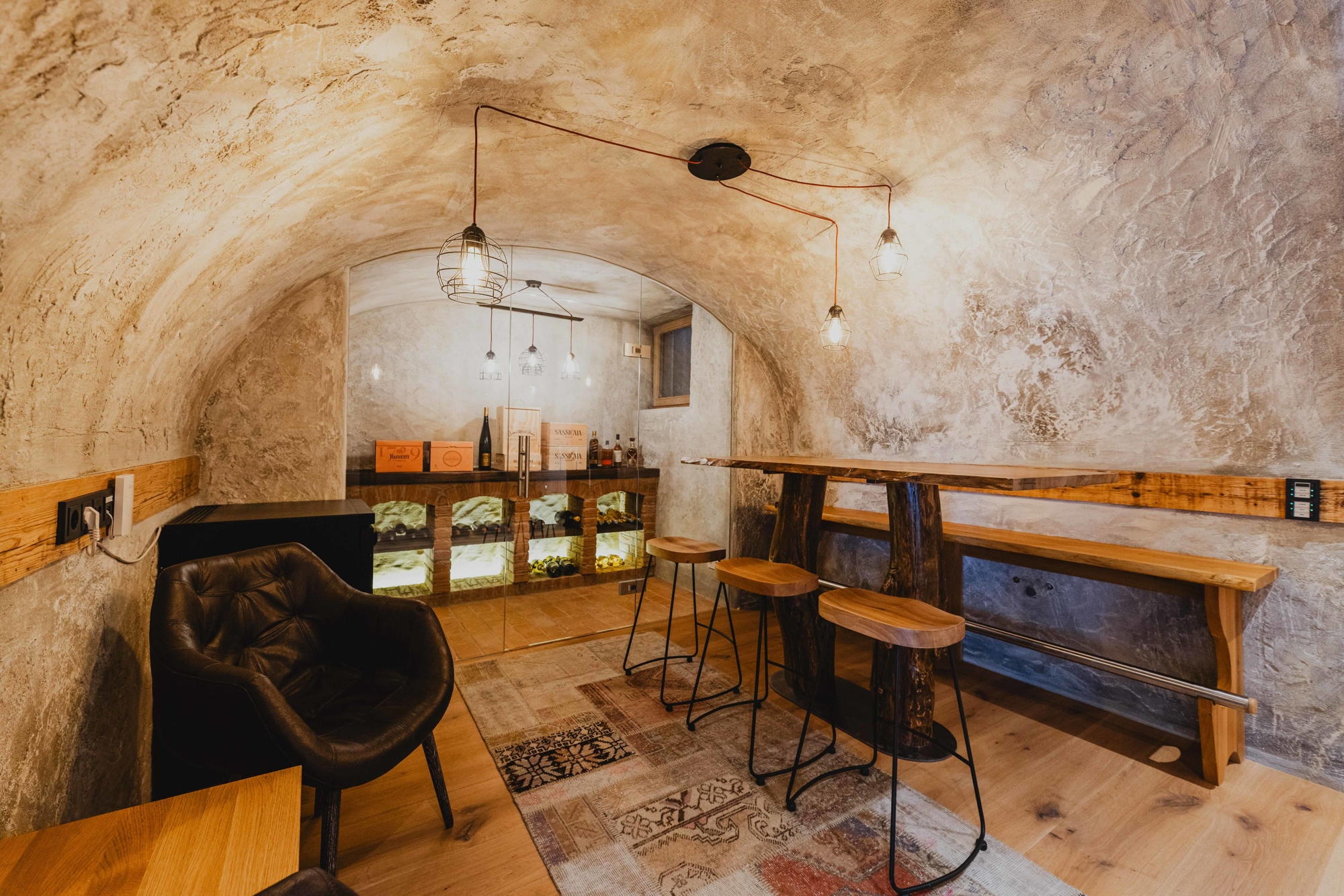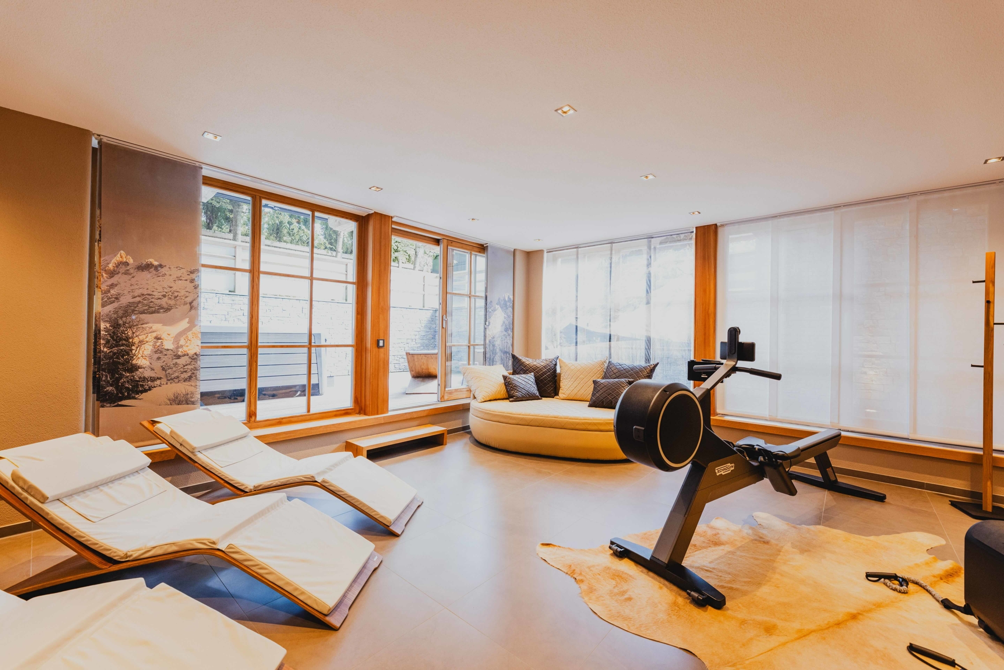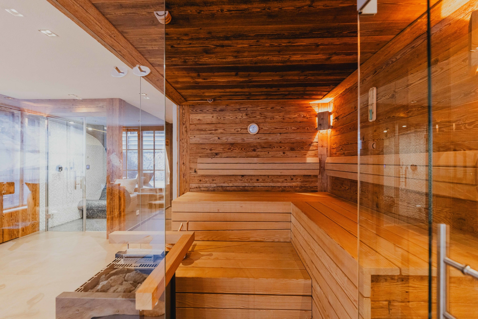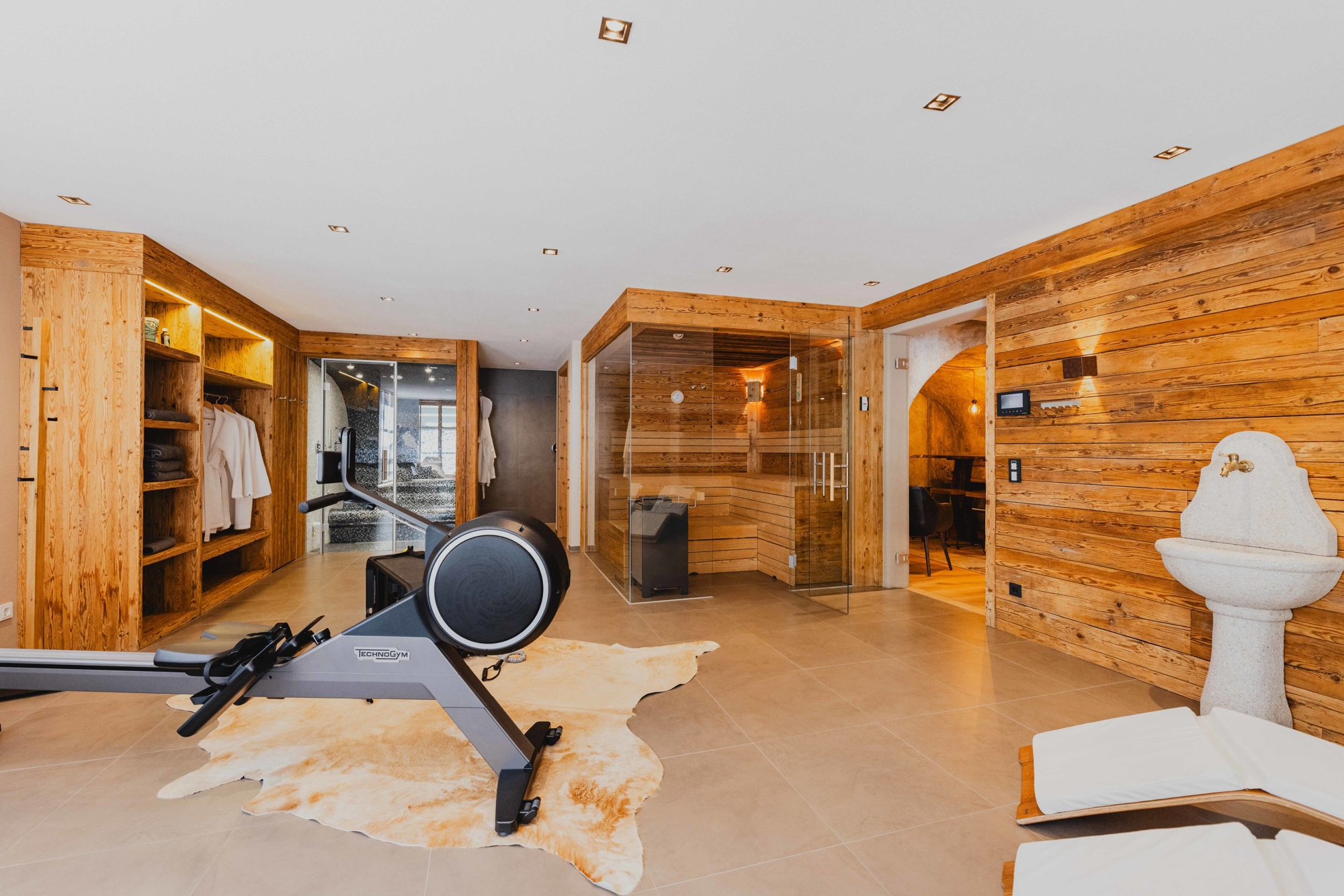 Das Untergeschoss ist der ideale Ort für Wellness und Entspannung: Ein großzügiger Wellnessbereich mit Sauna, Dampfbad, Dusche und WC, sowie ein Whirlpool auf der Terrasse, lassen keine Wünsche offen. Das Weingewölbe mit klimatisiertem und verglastem Lager, ein großer Waschraum mit Skistiefelheizung, sowie ein Kellerraum mit maßgefertigten Einbauschränken runden das Angebot ab.
