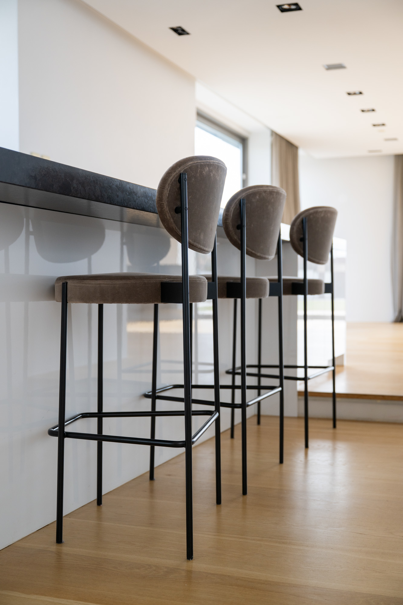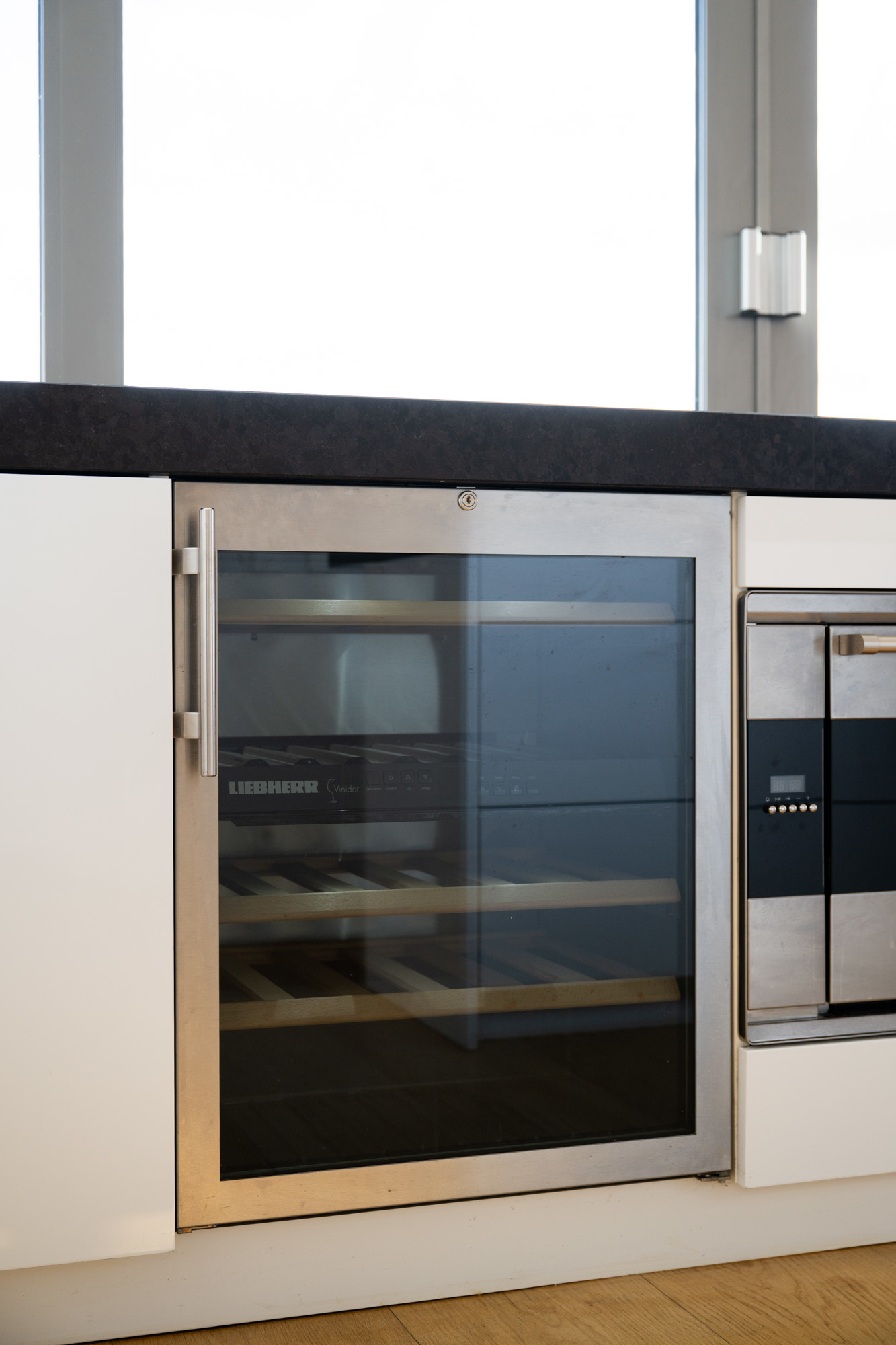 Die maßgefertigte Einbauküche mit hochwertigen Markengeräten, einem Weinkühlschrank und einem Side-by-Side-Kühlschrank mit Eiswürfelfunktion erfüllt höchste Ansprüche und wird zum kulinarischen Zentrum Ihres Zuhauses.