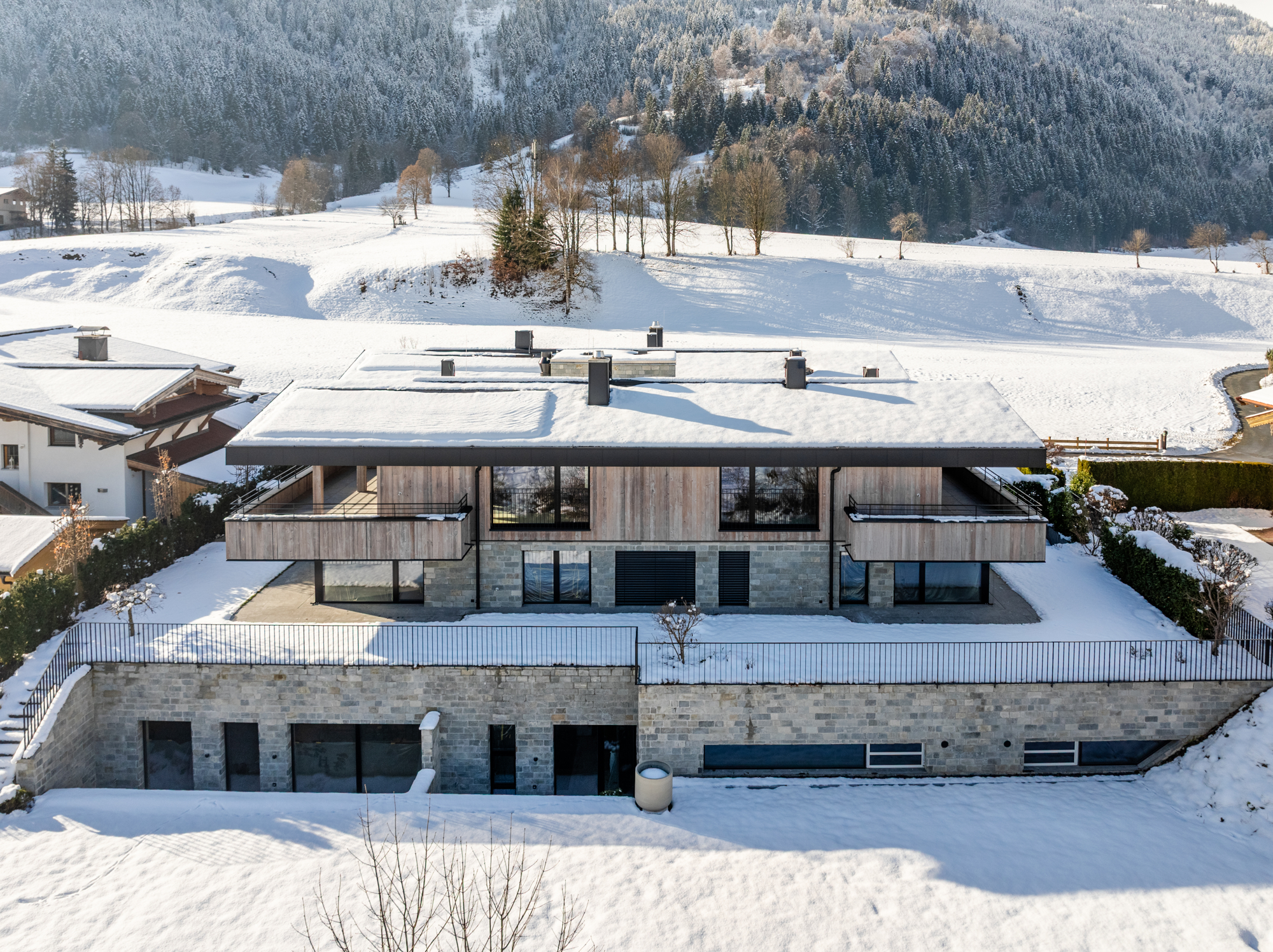 Jedes der beiden Chalets besticht durch seine klare architektonische Linie und die geschickte Verbindung aus traditionellem Holzbau und modernen Elementen. Große Glasfronten eröffnen den Blick auf das imposante Panorama der umliegenden Berge, während edle Materialien wie Naturstein, Altholz und feinste Textilien für ein behagliches Wohngefühl sorgen. Auf mehreren Etagen verteilen sich großzügige Wohn- und Schlafbereiche, Wellnesszonen mit Sauna, Fitnessraum und Innenpool sowie weitläufige Terrassen und Balkone – perfekte Rückzugsorte zu jeder Jahreszeit.