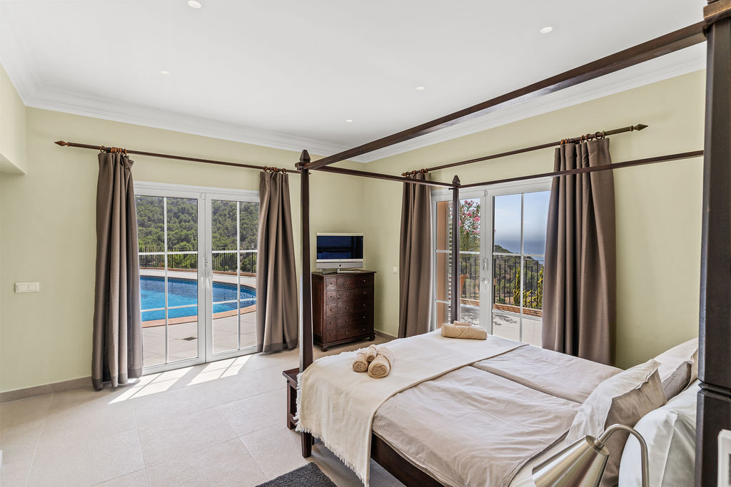 Im Obergeschoss erwarten Sie vier großzügige Schlafzimmer, jeweils mit modernem Bad en suite. Große Fensterfronten eröffnen von nahezu jedem Raum einen spektakulären Blick auf das glitzernde Meer, den Hafen von Puerto Andratx und die majestätische Bergkulisse – ein Panorama, das seinesgleichen sucht.