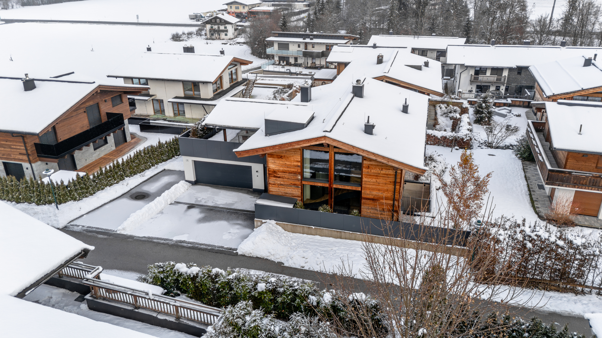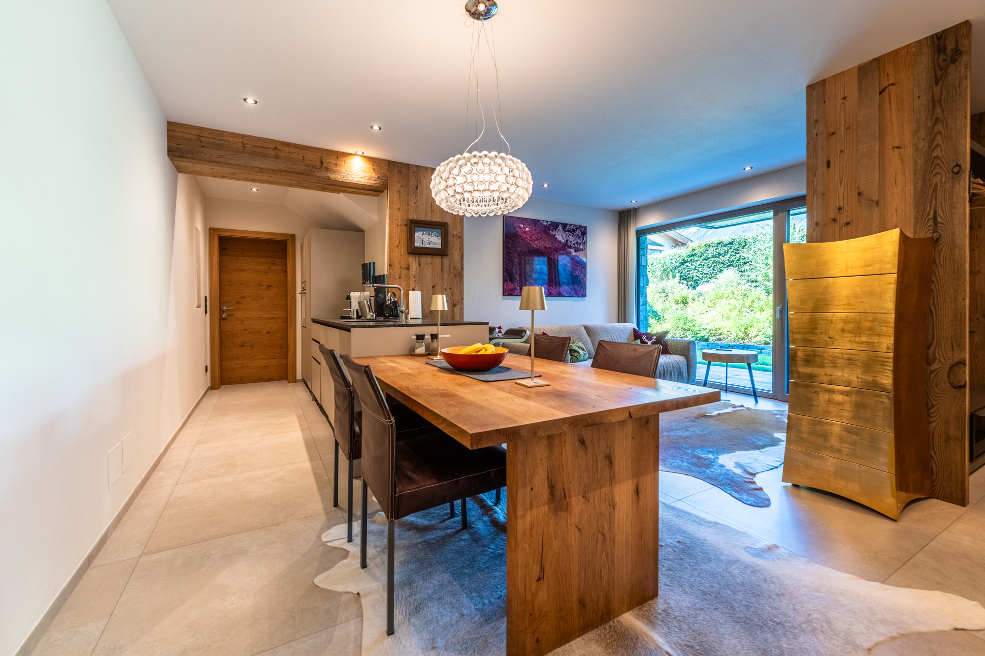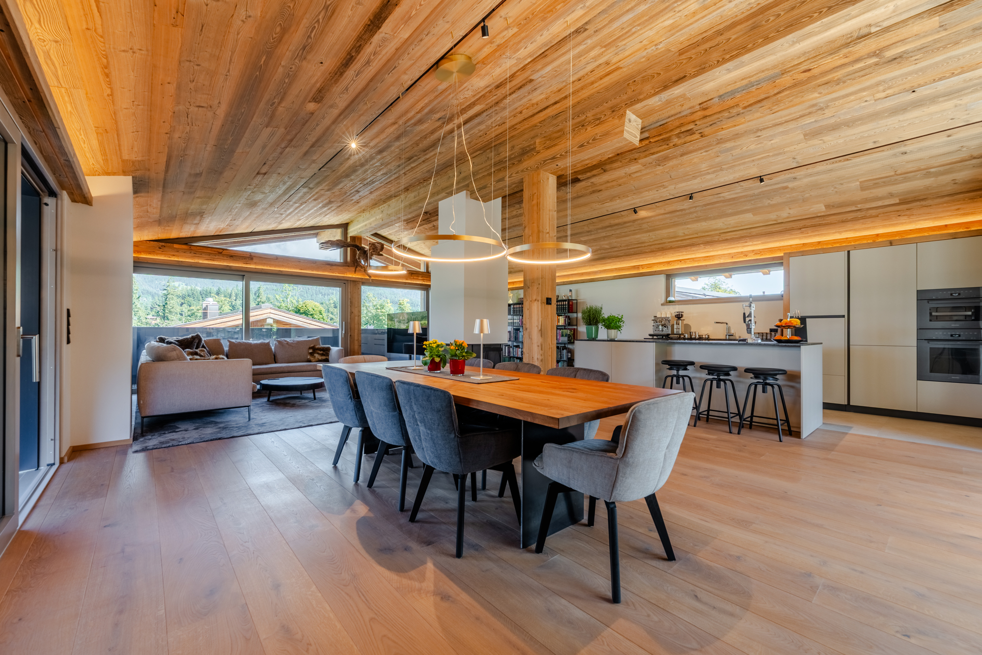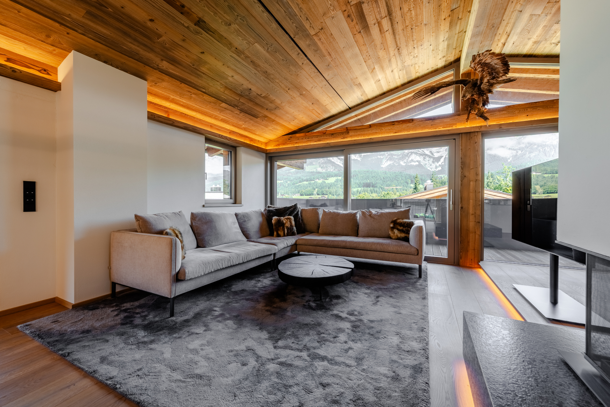 Die großzügig geschnittenen Wohnbereiche mit lichtdurchfluteten Räumen schaffen ein Ambiente, das gleichermaßen offen und behaglich wirkt. Die harmonische Verbindung von alpiner Eleganz und modernen Details verleiht der Immobilie ihren unverwechselbaren Charakter. Hochwertige Materialien, durchdachte Grundrisse und ein stilvolles Design machen jedes Zimmer zu einem Ort, an dem man gerne verweilt.