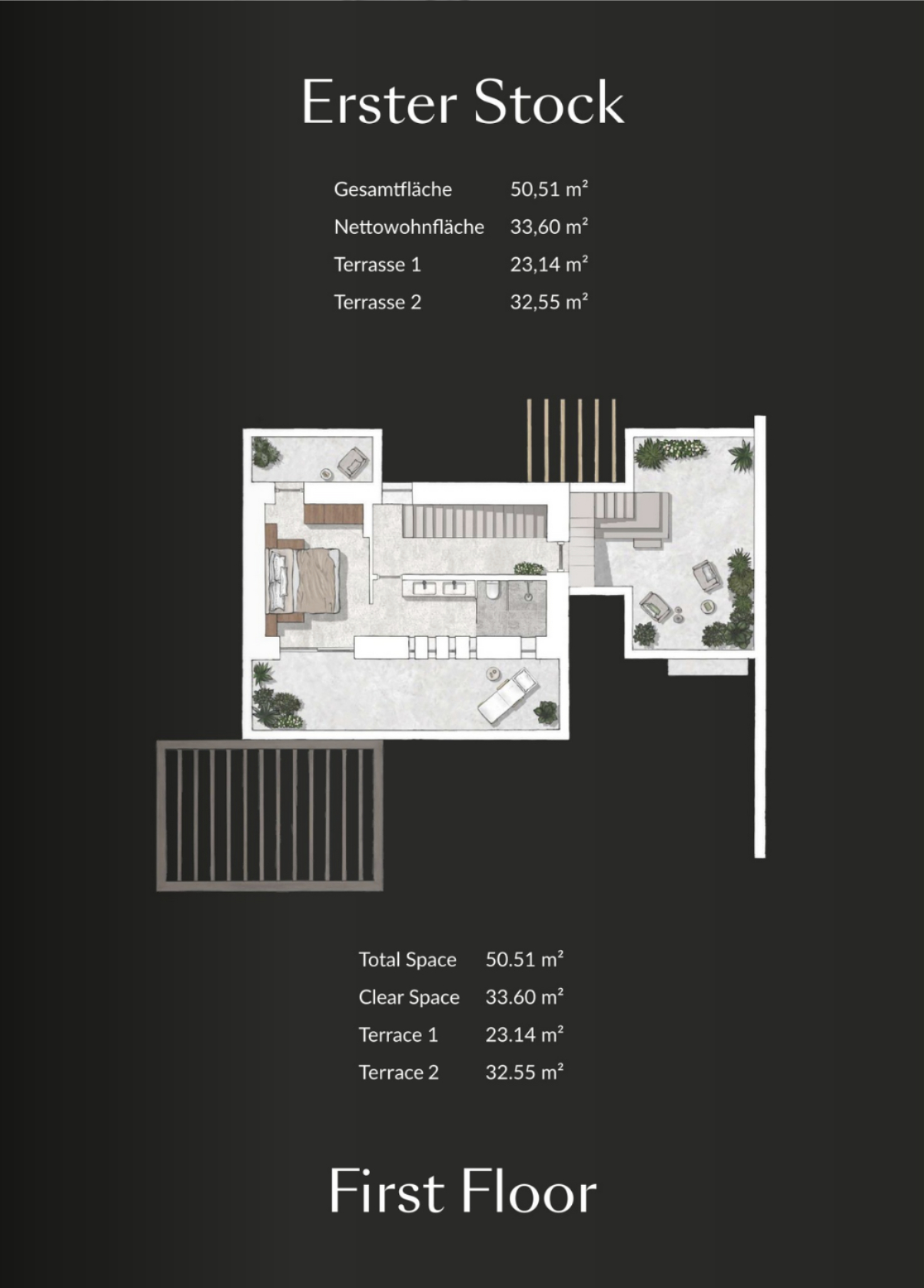 Jede Villa besticht durch eine klare Architektursprache, natürliche Materialien und großzügige Außenflächen, die fließend in die umgebende Natur übergehen. Mit einer Nettowohnfläche von ca. 140 m², einer Bruttogeschossfläche von ca. 223 m² sowie weitläufigen Terrassenflächen von rund 268 m² bieten die Villen viel Raum für Privatsphäre und Erholung.