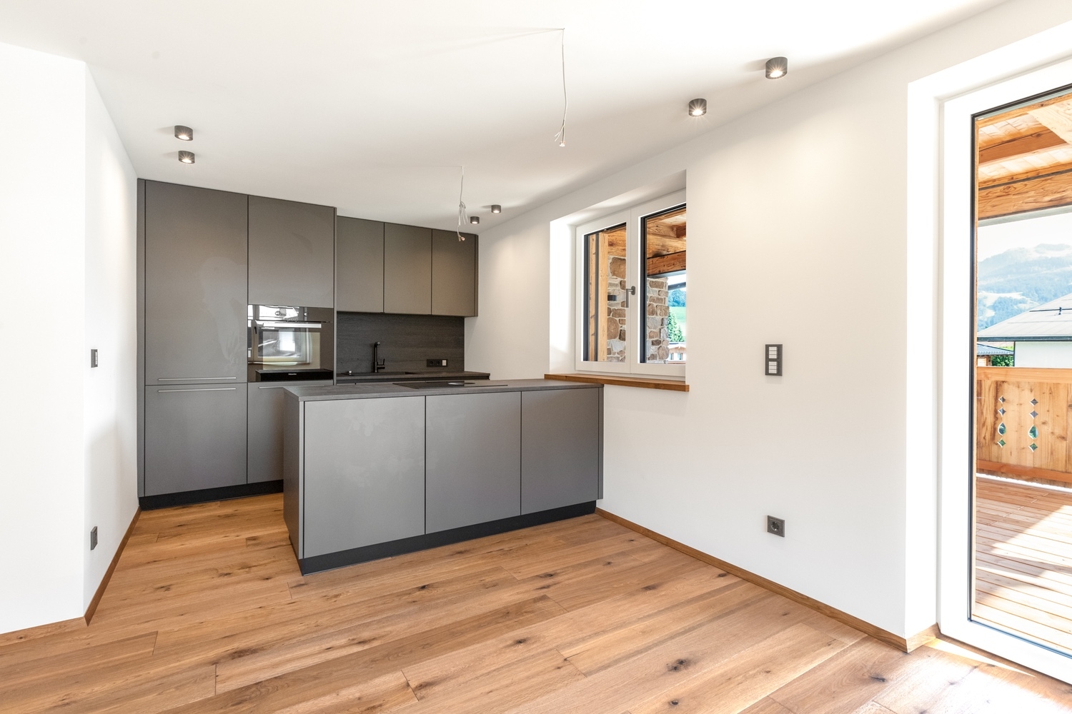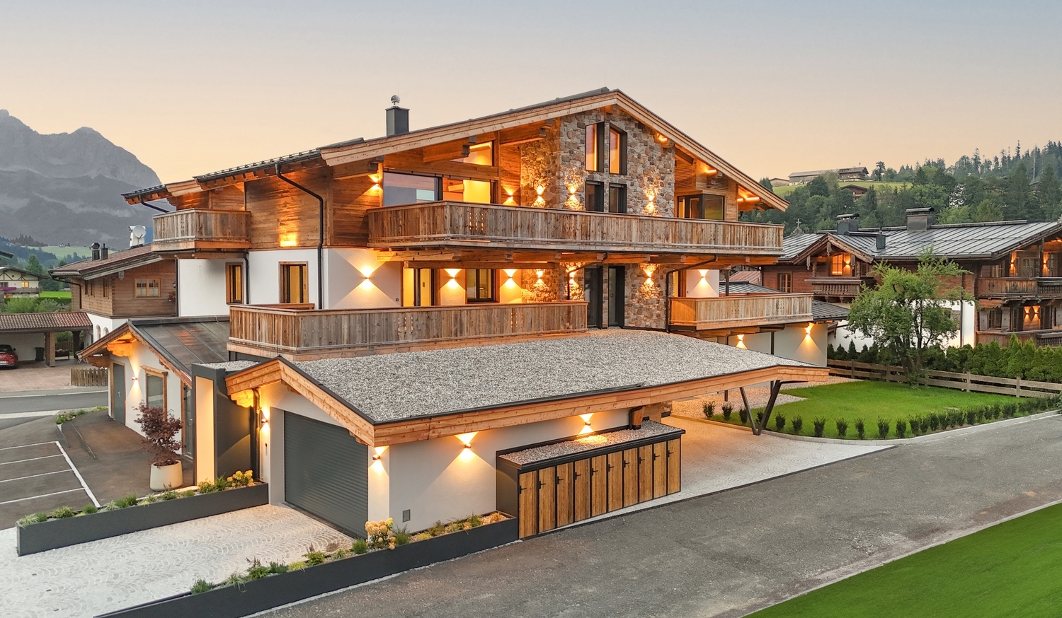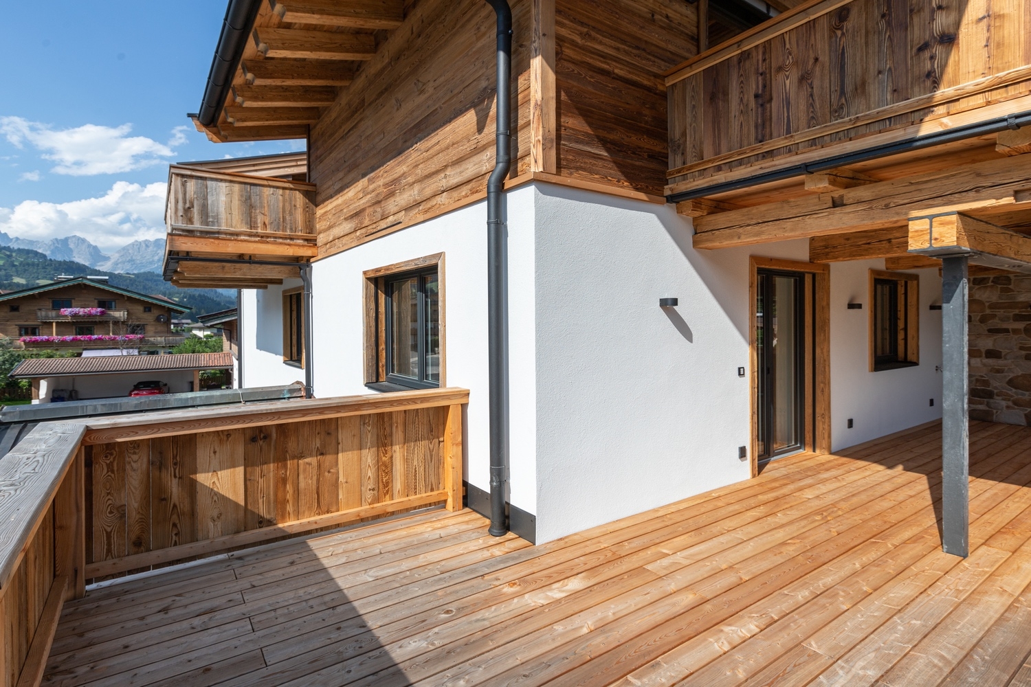 Im ersten Obergeschoss befinden sich zwei geschmackvoll gestaltete Wohneinheiten mit großzügigen Außenflächen. Hochwertige Materialien, Altholzelemente, Eichendielen, Designer-Küchen und ein erweiterbares BUS-System schaffen ein edles Ambiente und hohen Wohnkomfort. Die großzügigen Balkone und teilüberdachten Süd-Terrassen bieten einen traumhaften Blick auf den Wilden Kaiser und machen diese Einheiten zu besonderen Rückzugsorten.
