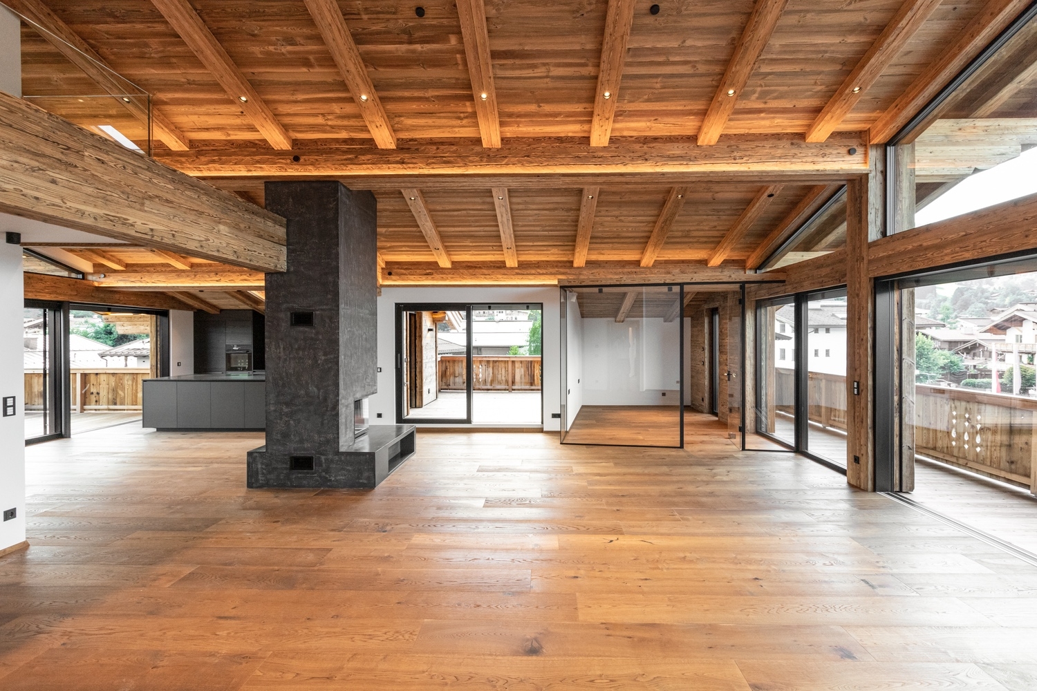 Das absolute Highlight der Liegenschaft ist das sensationelle Penthouse mit ca. 256 m² gewichteter Nutzfläche und einem fantastischen Ausblick auf die umliegende Bergwelt. Große Glasfronten, beeindruckende Raumhöhen und fein abgestimmte Altholzarbeiten verleihen dieser Einheit eine außergewöhnliche Atmosphäre. Das Penthouse verfügt über drei Schlafzimmer, davon zwei mit Bad en Suite, eine Sauna mit Blick Richtung Hahnenkamm, einen raumhohen Kamin sowie einen Personenlift mit Wohnungsfahrt. Modernste Haustechnik inklusive BUS-System rundet das exklusive Gesamtbild ab.