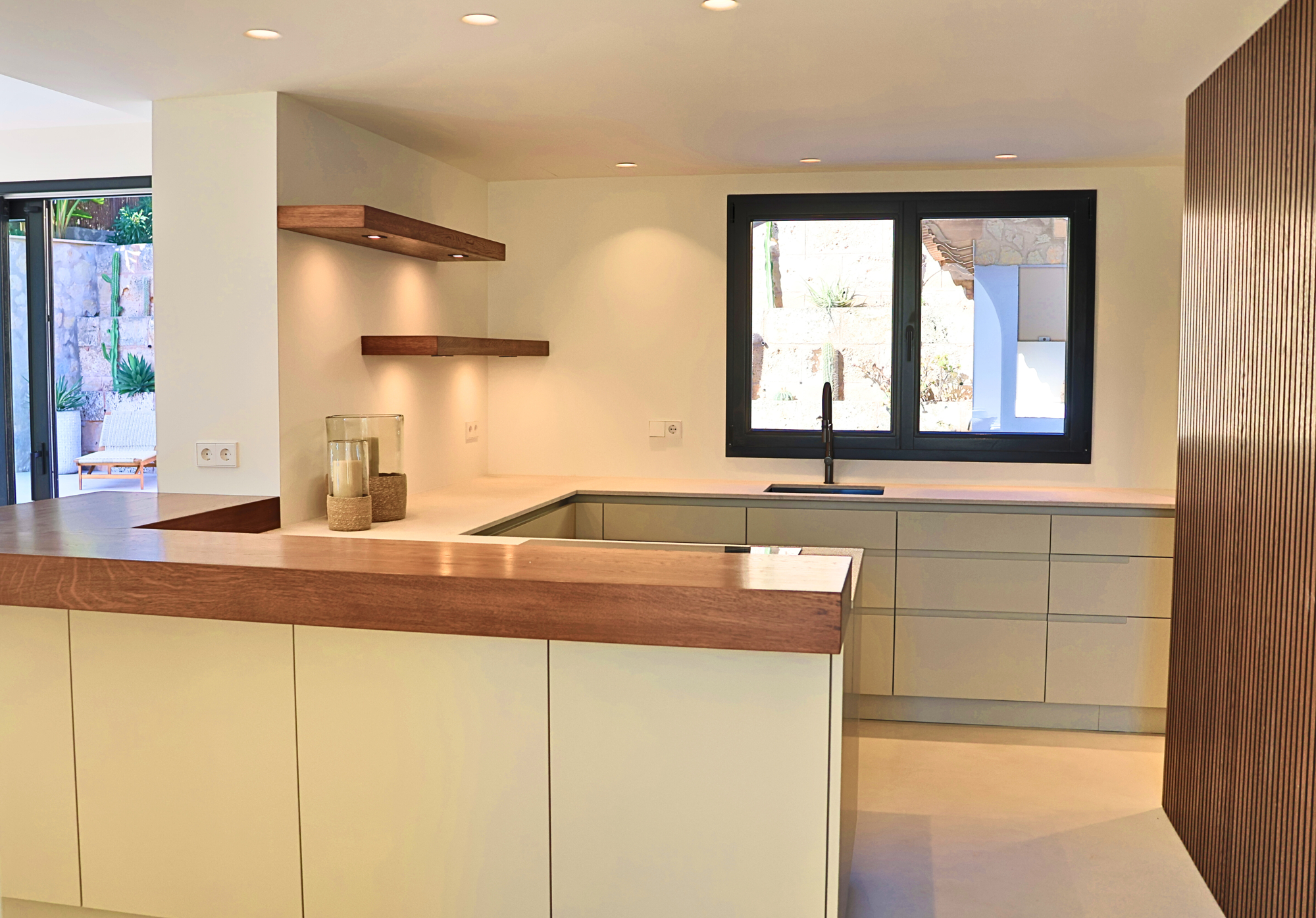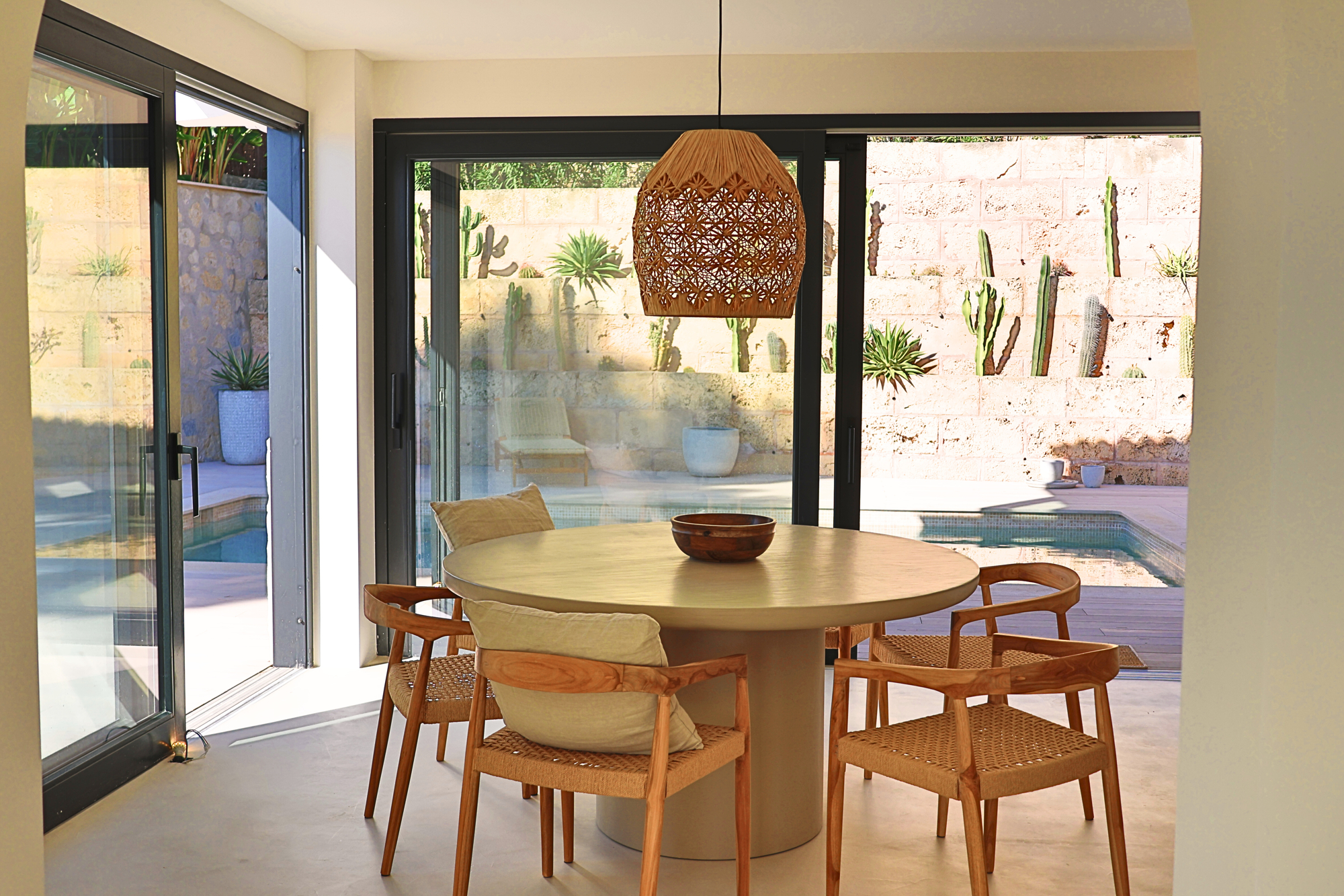 Das Outdoor-Erlebnis ist ein echtes Highlight: Weitläufige Terrassen eröffnen traumhafte Blickachsen auf das Meer und schaffen perfekte Orte für lange Sommerabende. Der Poolbereich wird von einem pflegeleichten mediterranen Garten elegant umrahmt – inklusive moderner Outdoor-Küche, ideal für entspanntes Hosting und unvergessliche Sunset-Momente. Nach Strandtagen oder Inselausflügen lädt zudem die private Sauna zum Abschalten ein.