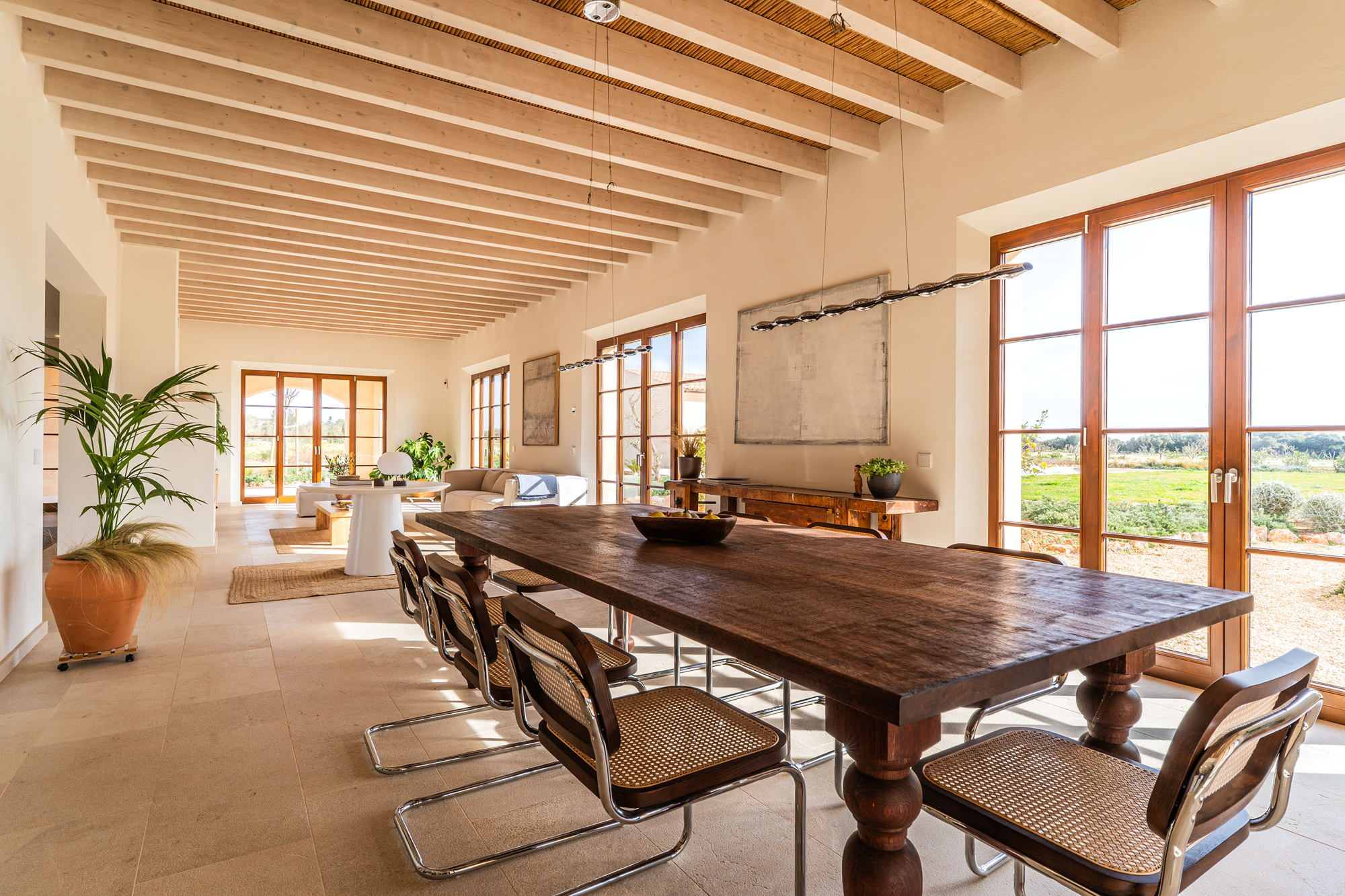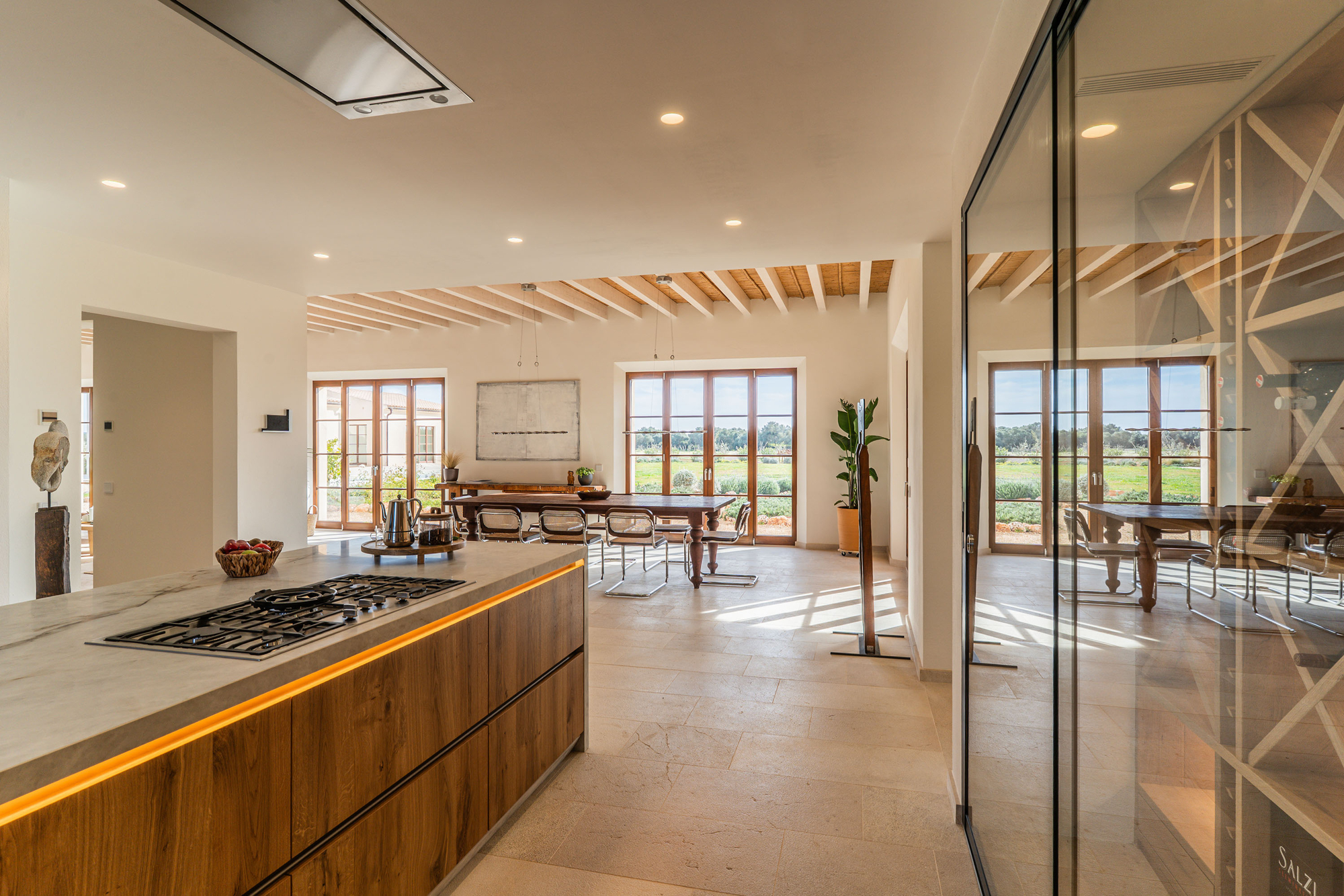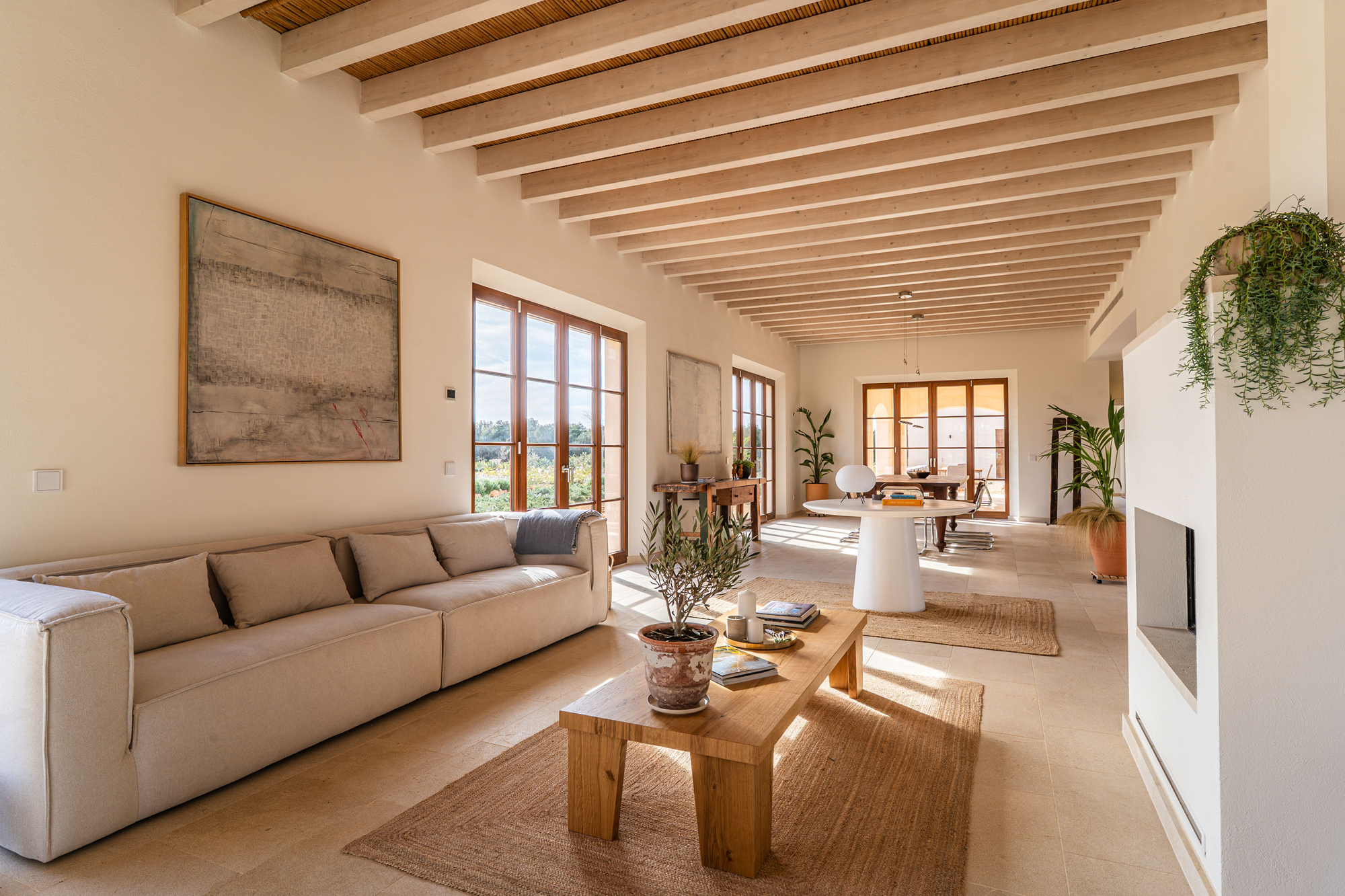 Die Finca besticht durch ein weitläufiges Ensemble aus Haupthaus, Poolhaus und einem separaten Gästehaus. Das Haupthaus empfängt Sie über einen großzügigen Eingangsbereich mit Garderobe und Treppe ins Obergeschoss. Von hier öffnet sich der Blick in den ca. 100 m² großen offenen Wohn-, Ess- und Küchenbereich – das Herzstück des Hauses: lichtdurchflutet, repräsentativ und perfekt auf das Leben zwischen Innen und Außen ausgerichtet. Im Erdgeschoss befinden sich zudem ein Arbeitszimmer sowie ein weiteres Schlafzimmer.